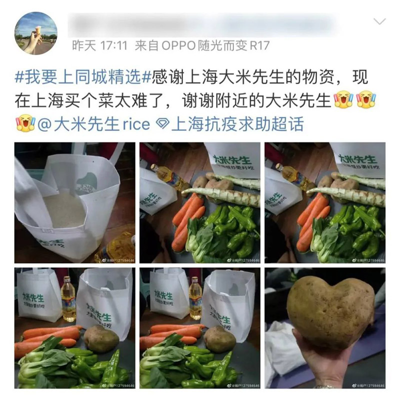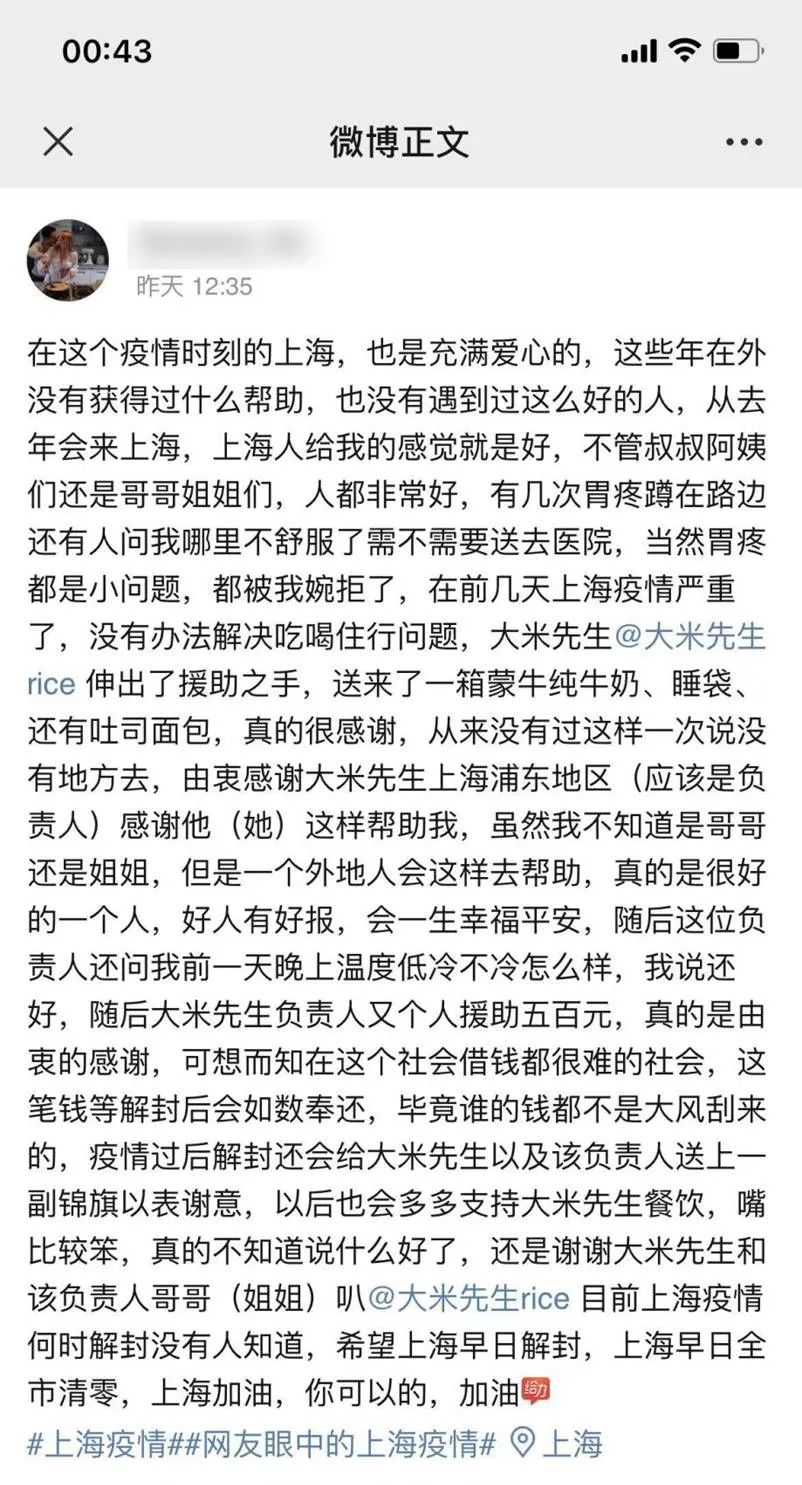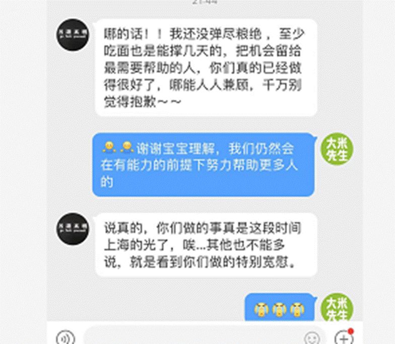 我和我的团队,有将近30%的人都来自武汉,都经历过2020年武汉的那场疫情。在武汉抗疫期间,“大米先生”的众多员工积极行动,挺身而出,为那些在抗疫一线战斗的医护人员和方舱医院建设工人们送上了热饭热菜。如今这些伙伴们,正在继续发扬抗疫精神,用自己的爱和善,共同守“沪”。